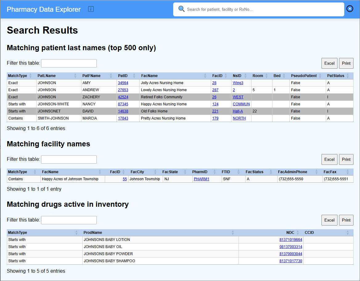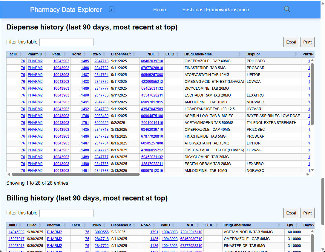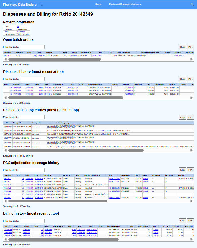 Clickable IDs to jump to your data, including facility, patient, order, drug, dispense, bill and prescriber